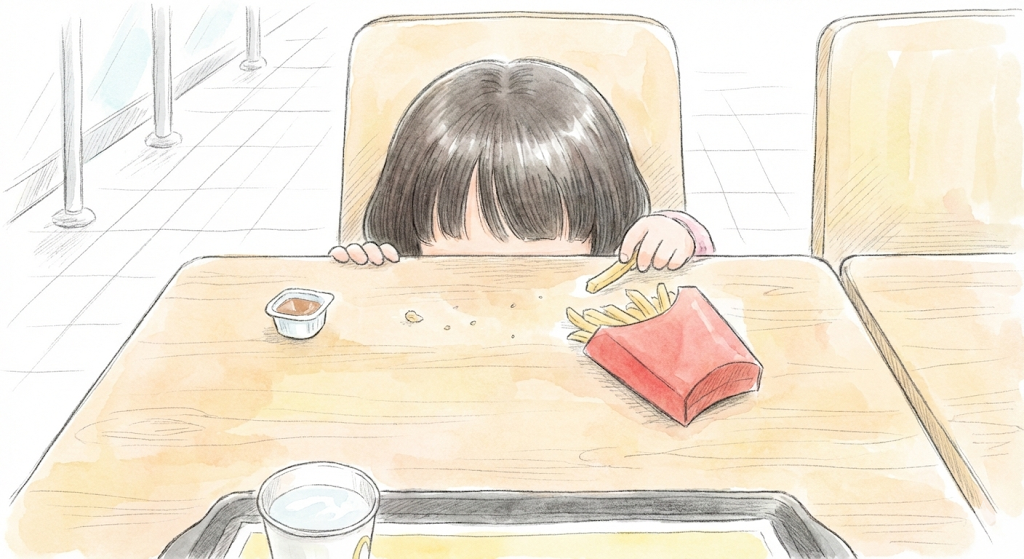 食事中、まだ小さい手でポテトを掴むので、ボロボロと食べこぼしが出ます。 もしこれが自分の実子であれば、「こぼさないの」と反射的に注意していたでしょう。 でも、言えませんでした。 嫌われるのが怖くて、私は無言でテーブルに落ちたポテトを拾ってたような曖昧な記憶があります。