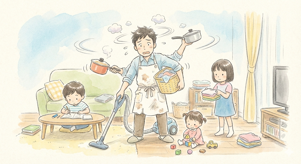 我が家は5人家族。 育ち盛りの子供たちの学校の用意、大量の洗濯物、食事の準備、掃除。 そして、妻の病院への付き添い。 当然、私自身の仕事もあります。